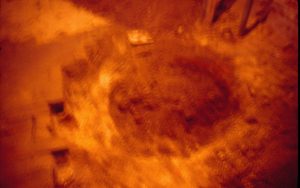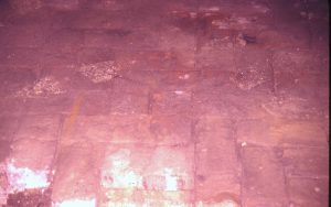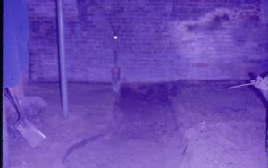 Lyon House - basement, possible Cistern uncovered in basement floor (photo blurry). Brick pattern flooring on left, support beams in background right. Square drain cover? in background center Looking South from basement Lyon, Basement, brick floor, cistern