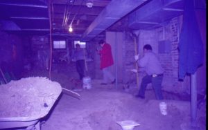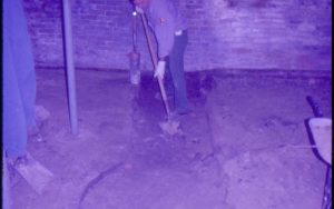 Lyon House - basement. Maintenance Workers Tom Melton? in background, and Tom Pacha dig out trench while Curator Susan Haake checks out the flooring near the doorway. Wheel barrow and square floor drain in foreground. Cords and other equipment scattered around. Circuit breaker box visible behind Tom Pacha Looking South/Southwest in basement Lyon, Basement, staff,…