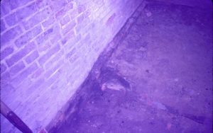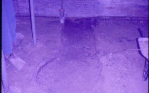 Lyon House - basement showing possible Cistern location. (photo blurry). Brick floor pattern on left, metal supports on background right. Square drain cover? in background center Looking South from basement Lyon, Basement, cistern, brick floor