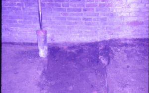 Lyon House - basement, closeup of wall where trench meets it. Floor is made up of dirt and brick rubble. Shovel leaning up against brick wall in background. Looking North from basement Lyon, Basement, brick wall, trench