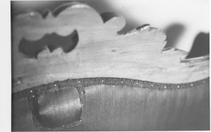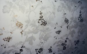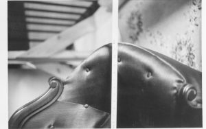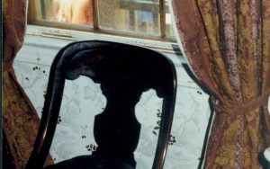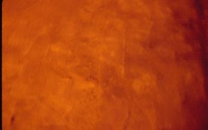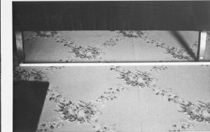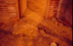 Lyon House - basement, brick floor pattern (photo blurry). Drain in foreground, Access doorway behind brick floor pattern, set in brick wall Looking West in basement Lyon, Basement, brick floor, drain, door