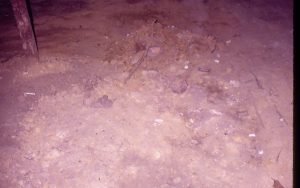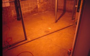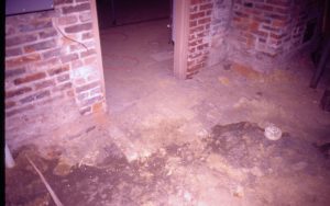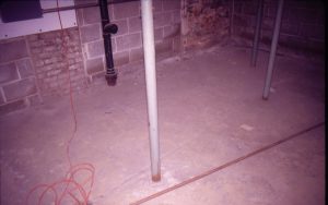 Lyon House - basement, possible cistern location in foreground near drain. Support beam on left, brick wall in background Looking North in basement Lyon, Basement, cistern, brick wall