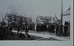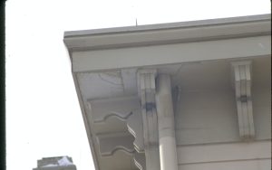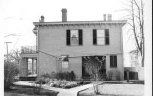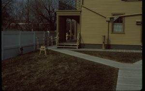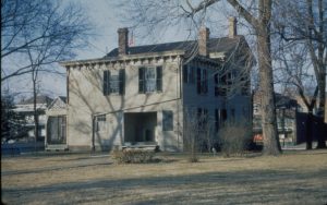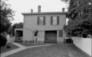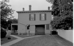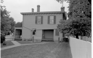 Lincoln Home east (rear) elevation and backyard. Historically accurate guttering visible across siding and window. Well and cistern pumps seen near sidewalks. Herb garden is located in triangle near Home, with other bushes scattered around yard. A stairwell heading to basement seen a right. Dean House visible in background right. Utility pole seen at left. Looking west from near Lincoln Barn Lincoln Home, backyard, pumps, herb garden, gutters, Dean, utility pole