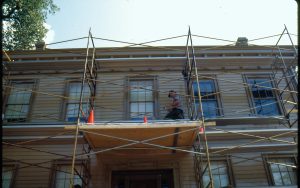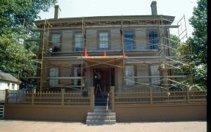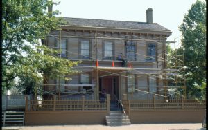 Elm tree replacement - Maintenance Workers Tom Melton, Charlie McCoy and Vee Pollock? replacing sidewalk after new tree planted in brick plaza in front of Lincoln Home. Visitors walk by on far left. Morse House visible in far background left. Lincoln Barn visible behind Lincoln Home in background right. Looking East from 8th and Jackson…