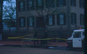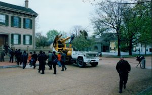 Elm tree replacement - Pleasant Nursery staff tying down tree for transport from front of Lincoln Home brick plaza. Reporters watch on far right in front of unpainted Arnold Barn. Looking East from west side of 8th Street Elm tree, 8th Street, Lincoln Home, brick plaza, Pleasant Nursery, reporters