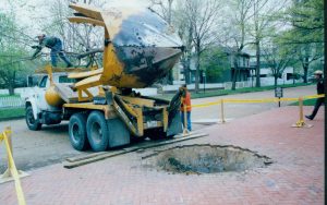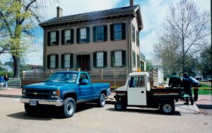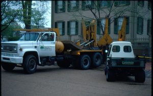 Elm tree replacement - Maintenance Workers Charlie McCoy, Tom Pacha and Vee Pollock start set up for tree replacement on brick plaza in front of Lincoln Home. Cushman parked on 8th Street. Morse House in far background left. Looking Northeast from 8th and Jackson Street intersection Elm tree, Lincoln Home, brick plaza, staff, Morse, 8th…