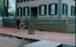 Elm tree replacement - Job completed with new elm tree planted on brick plaza in front of Lincoln Home. Cage replaced, bricks replaced in plaza. Ranger ? comes down steps. Looking Northeast from 8th and Jackson Street intersection Elm tree, Lincoln Home, brick plaza, staff