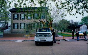 Elm tree replacement - Pleasant Nursery beginning removal of tree in front of Lincoln Home in brick plaza. Maintenance cushman blocks view of equipment removing tree. A ranger watchs from near the Lincoln Home front steps. Morse House in the far background left Looking Northeast from 8th and Jackson Street intersection Elm tree, Lincoln Home,…