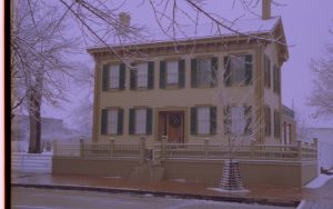 Home, front winter view. Holiday decorations Lincoln Home, Snow Home, front winter view. Holiday decorations Lincoln Home, Snow