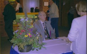 Man sitting at table with flower arrangement. Colloquium Man sitting at table with flower arrangement. Colloquium