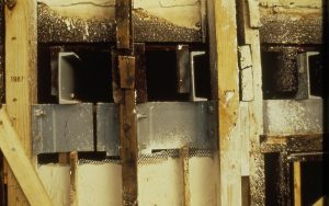 View of second floor space along scaffolding during the 1987-1988 Restoration. Soffit and cornices have been stripped of paint. Siding has been removes, and three window frames can be seen at photo, center. Exact location unknown.