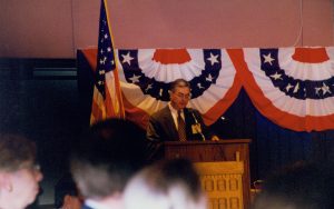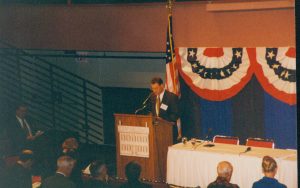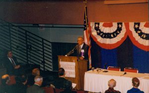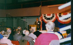 Man at posium with bunting hung behind. 1-1997 Colloq (color); 15 Colloquium, 1997 Man at posium with bunting hung behind. 1-1997 Colloq (color); 15 Colloquium, 1997