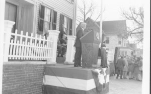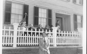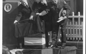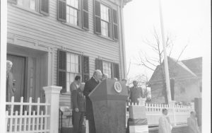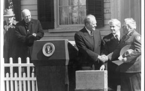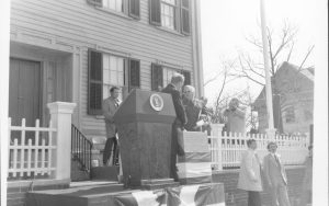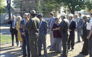 Dignitaries in front of Lincoln Home Lincoln Home NHS- President Ford and V.C. Corner Stone, neg #8 class 1000, class 8 pic 8, 118 President, Ford, visit, dedication