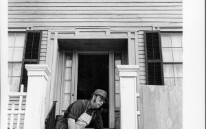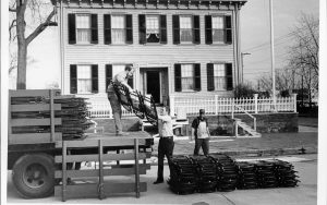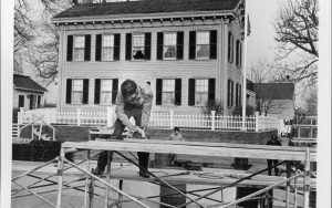 Getting ready for President Ford trip, Greg Williams (in window) is from White House staff, Steve DeLay works on platform Lincoln Home NHS- President Ford and V.C. Corner Stone, 1000, class 8 pic 4 President, Ford, visit, dedication