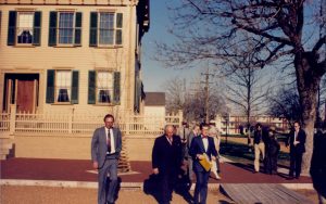 Group stepping off curb in front of Lincoln home. Lincoln Home NHS- City Council Ollie Christmas Award Michel, tour, visit Group stepping off curb in front of Lincoln home. Lincoln Home NHS- City Council Ollie Christmas Award Michel, tour, visit
