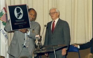 Man holding framed picture of Lincoln silhouette. Lincoln Home NHS- Paul Findley Recognition Award, 3 Finley, award Man holding framed picture of Lincoln silhouette. Lincoln Home NHS- Paul Findley Recognition Award, 3 Finley, award
