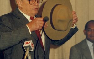 Man holding Ranger hat. Lincoln Home NHS- Paul Findley Recognition Award, 4314 Finley, award Man holding Ranger hat. Lincoln Home NHS- Paul Findley Recognition Award, 4314 Finley, award