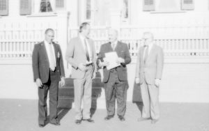 Four men standing in front of Lincoln home. Lincoln Home NHS- Paul Findley and Michel VIP visit, 127 Finley, Michel, visit, tour Four men standing in front of Lincoln home. Lincoln Home NHS- Paul Findley and Michel VIP visit, 127 Finley, Michel, visit, tour