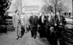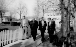 Group of men walking on brick walk by Visitor Center. Lincoln Home NHS- Paul Findley and Michel VIP visit, 128 Finley, Michel, visit, tour Group of men walking on brick walk by Visitor Center. Lincoln Home NHS- Paul Findley and Michel VIP visit, 128 Finley, Michel, visit, tour