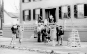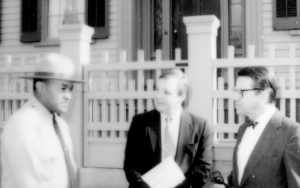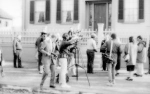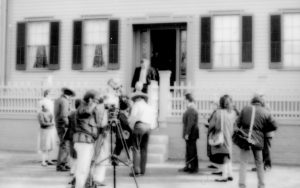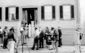 People standing on sidewalk in front of house. Lincoln Home NHS- Durbin and Simon, 79 Durbin, Simon, visit, media People standing on sidewalk in front of house. Lincoln Home NHS- Durbin and Simon, 79 Durbin, Simon, visit, media