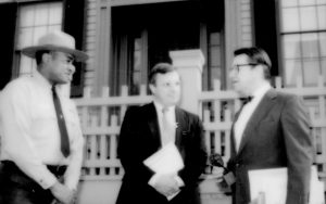 Three men , one holding Lincoln sculpture. Lincoln Home NHS- Durbin and Simon, 77 Durbin, Simon, visit Three men , one holding Lincoln sculpture. Lincoln Home NHS- Durbin and Simon, 77 Durbin, Simon, visit