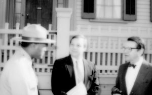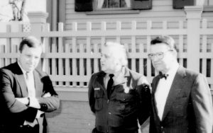 Three men in front of fence. Lincoln Home NHS- Durbin and Simon, 77 Durbin, Simon, visit, media Three men in front of fence. Lincoln Home NHS- Durbin and Simon, 77 Durbin, Simon, visit, media