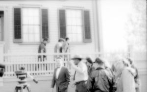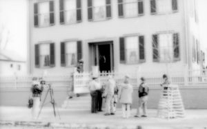 People standing on sidewalk in front of house. Lincoln Home NHS- Durbin and Simon, 79 Durbin, Simon, visit, media People standing on sidewalk in front of house. Lincoln Home NHS- Durbin and Simon, 79 Durbin, Simon, visit, media