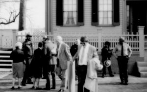 People standing on sidewalk in front of house. Lincoln Home NHS- Durbin and Simon, 77 Durbin, Simon, visit People standing on sidewalk in front of house. Lincoln Home NHS- Durbin and Simon, 77 Durbin, Simon, visit