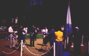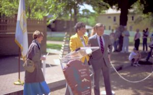 People standing around podium in front of Home. Lincoln Home NHS- Durbin, 24C, artifact #744 press, conference, interview People standing around podium in front of Home. Lincoln Home NHS- Durbin, 24C, artifact #744 press, conference, interview