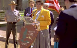 Lady speaking with others standing behind her. Lincoln Home NHS- Durbin, 24C, artifact #744 press, conference, interview Lady speaking with others standing behind her. Lincoln Home NHS- Durbin, 24C, artifact #744 press, conference, interview