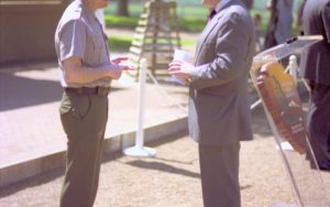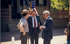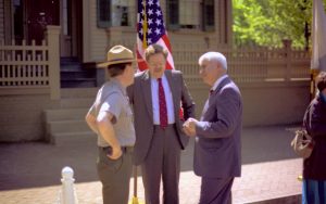 Ranger and man talking. Lincoln Home NHS- Durbin, 24C, artifact #744 press, conference, interview Ranger and man talking. Lincoln Home NHS- Durbin, 24C, artifact #744 press, conference, interview