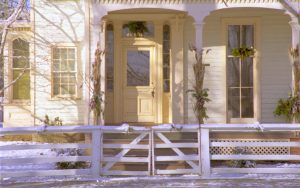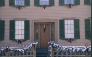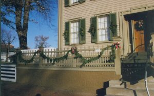 Exterior front of Lincoln home with Christmas decorations. Lincoln Home NHS- Christmas in Lincoln Home 1997, HS-20 Film Roll #17 Christmas, decorations