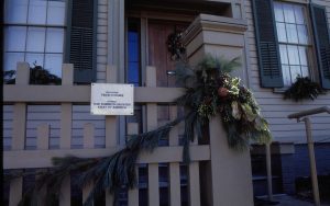 Exterior front post and door of L:incoln home with Christmas decorations. Lincoln Home NHS- Christmas in Lincoln Home 1997, HS-20 Film Roll #17 Christmas, decorations