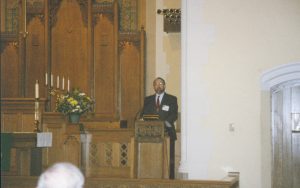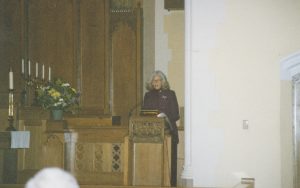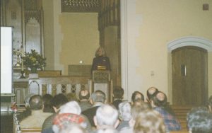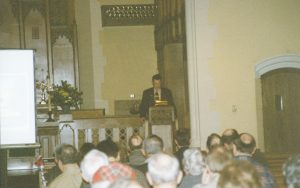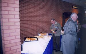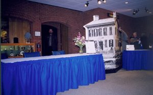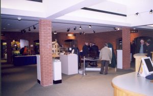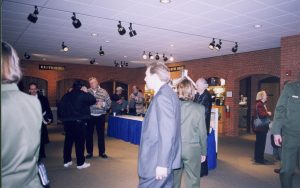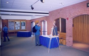Lincoln's Birthday - Visitors gather before lectures and talk to Illlinois State Historical Society Director Bill Furry (behind table). 7th Street entrance in background center. Restroom arches on right. Looking Northwest from main area Lincoln's Birthday, Illinois State Historic Society, visitors, Visitor Center