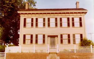 Lincoln Home West (Front) elevation in summer with numerous trees and bushes around. Empty Carrigan lot on left, large houses on far left and behind the house (now empty lots). Two square metal plaques on either side of gate. A fire hydrant is on corner. House appears to be painted white Looking east from across…