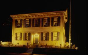 Lincoln Home west (front) elevation at night. Lighted flagpole on corner behind picket fence on right. Lights on inside house. Looking East from 8th Street Lincoln Home, night, 8th Street, flagpole
