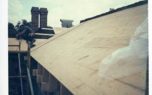 Stuve House, 3/8 inch plywood being applied to North side of West end of main roof Lincoln Home NHS- Stuve House Stuve House, restoration, roof Stuve House, 3/8 inch plywood being applied to North side of West end of main roof Lincoln Home NHS- Stuve House Stuve House, restoration, roof